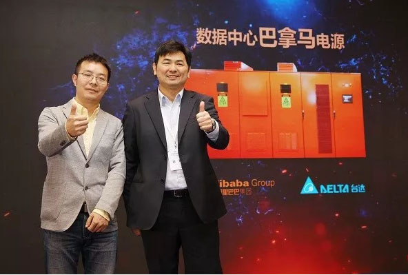 阿里巴巴數(shù)據(jù)中心基礎(chǔ)架構(gòu)高級(jí)專家劉水旺(左)與臺(tái)達(dá)數(shù)據(jù)中心電源研發(fā)負(fù)責(zé)人詹智強(qiáng)(右),于2019 數(shù)據(jù)中心年度峰會(huì)現(xiàn)場(chǎng)宣布“數(shù)據(jù)中心巴拿馬電源”正式推出