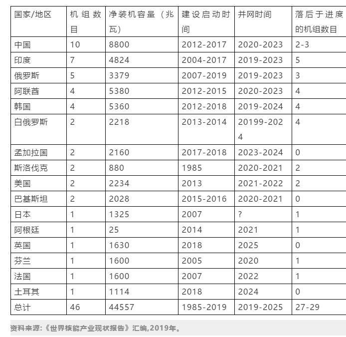 截至2019年7月1日,在建反應(yīng)堆有46座,是10年來的最低數(shù)量,已連續(xù)第六年下降——比WNISR一年前報(bào)告的數(shù)字少了4座,比2013年少了22座(其中5座后來已經(jīng)被廢棄)。四分之三的反應(yīng)堆建在亞洲和東歐。共有16個(gè)國家正在建設(shè)核電站,比WNISR2018報(bào)告的多一個(gè)英國。