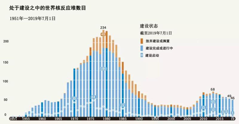 2019年上半年,全球啟動了四座反應(yīng)堆,其中中國兩座(臺山2號、陽江6號),俄羅斯一座(Novovoronezh2-2),韓國一座(Shin-Kori-4);與此同時(shí),美國關(guān)閉了一座(Pilgrim-1)反應(yīng)堆。