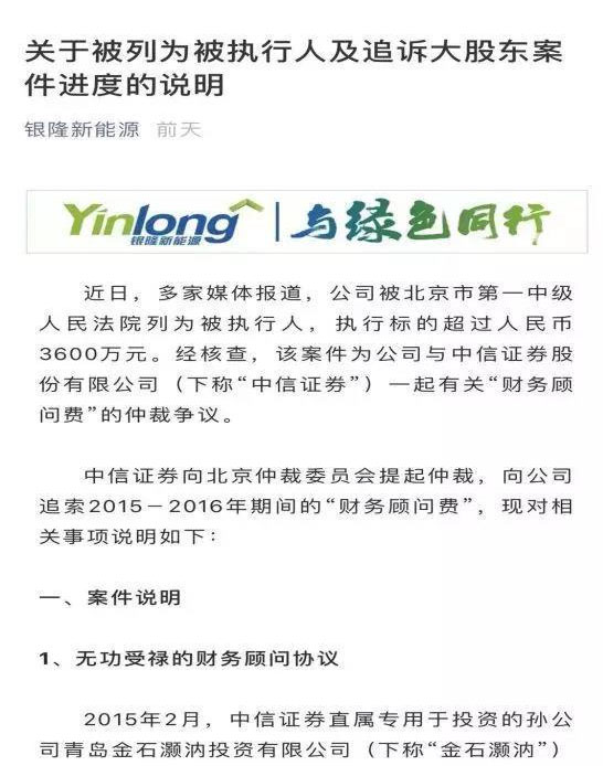 不料事情出現(xiàn)大逆轉(zhuǎn)。11月20日晚,銀隆新能源在其官方微信公眾號公開發(fā)布《關(guān)于被列為被執(zhí)行人及追訴大股東案件進度的說明》,指出“經(jīng)核查,該案件為公司與中信證券一起有關(guān)‘財務(wù)顧問費’的仲裁爭議。”
