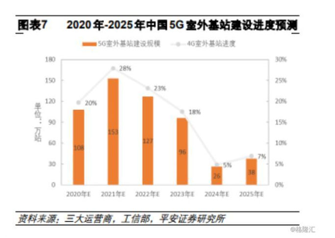 另外,按照5G室外基站覆蓋半徑大約是4G室外基站的一半,5G室外基站數(shù)目至少是現(xiàn)有4G室外基站的2倍來算,根據(jù)平安證券預(yù)計(jì),中國電信至少需要200萬站5G室外基站,中國移動(dòng)至少需要360萬站5G室外基站,中國聯(lián)通至少需要180萬站 5G 室外基站。