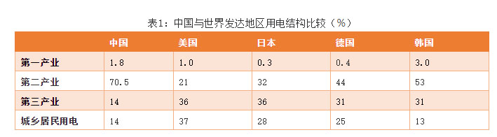 發(fā)達(dá)國(guó)家的電力消費(fèi)結(jié)構(gòu)基本呈現(xiàn)第二產(chǎn)業(yè)用電、第三產(chǎn)業(yè)用電和居民用電相對(duì)均衡的特征。目前隨著我國(guó)電力需求增長(zhǎng)的逐步轉(zhuǎn)變,電力消費(fèi)結(jié)構(gòu)朝著均衡方向發(fā)展,第三產(chǎn)業(yè)和居民用電比重將逐步提高,相應(yīng)的第二產(chǎn)業(yè)用電比重逐步下降,但短期內(nèi)下降到50%以下的可能性較低,未來(lái)電力消費(fèi)結(jié)構(gòu)可能更接近于同為制造業(yè)強(qiáng)國(guó)的德國(guó)和制造業(yè)較強(qiáng)的韓國(guó)的用電結(jié)構(gòu)。