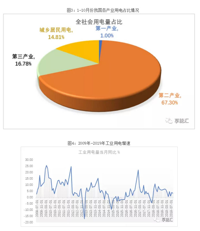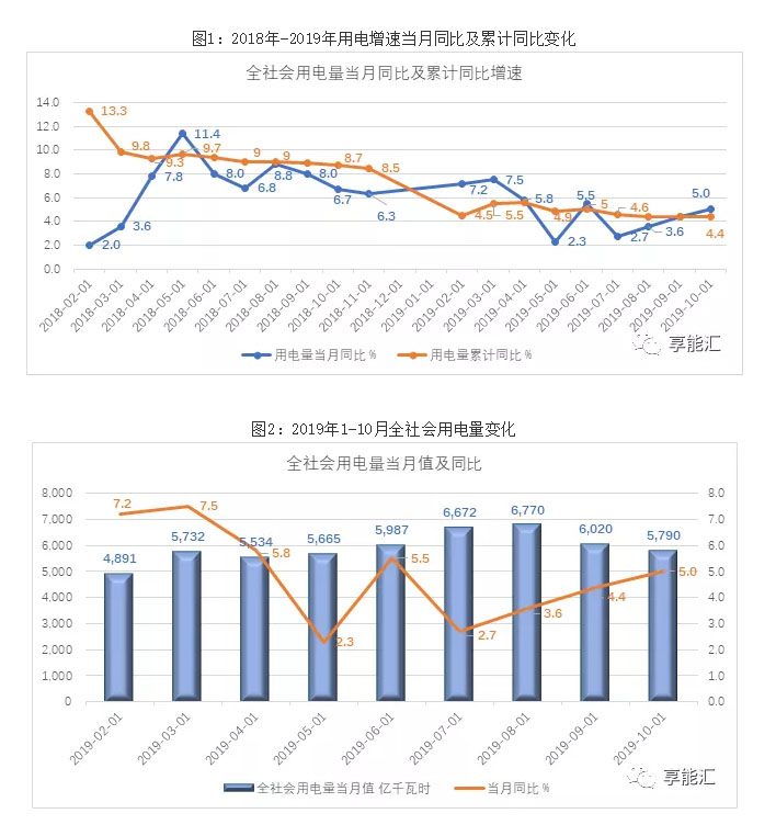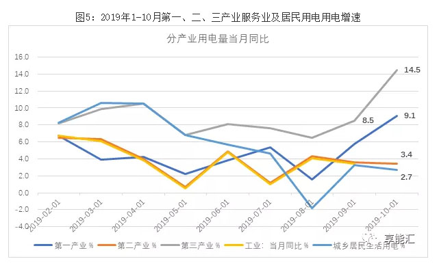 經(jīng)歷了2018年全社會(huì)用電量8.4%的高速增長(zhǎng)后,由于經(jīng)濟(jì)下行壓力以及2018年的高基數(shù)影響,2019年增速出現(xiàn)下滑。2019年1-10月,全社會(huì)累計(jì)用電量59232億千瓦時(shí),同比增長(zhǎng)4.4%,增速比上年同期下降4.3個(gè)百分點(diǎn)。2019年10月份,全國(guó)全社會(huì)用電量5790億千瓦時(shí),同比增長(zhǎng)5.0%,增速比上年同期下降2.3個(gè)百分點(diǎn)。雖然用電量增速出現(xiàn)下滑,但用電結(jié)構(gòu)正在悄然變化。