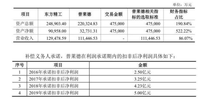 47.5億元的收購價(jià)格是當(dāng)時(shí)普萊德資產(chǎn)凈額的5.22倍。同時(shí),普萊德也做出了業(yè)績承諾,承諾2018年扣非凈利潤4.23億元,2019年扣非凈利潤5億元。