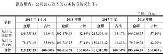 首先看看主營業(yè)務情況,晶科電力主營業(yè)務分為光伏電站運營和EPC 兩大板塊。報告期內,光伏電站運營業(yè)務收入分別為10.61 億元、21.55 億元、30.29 億元和13.98 億元,占營業(yè)收入的比重分別為57.10%、53.17%、42.86%和64.04%;光伏電站EPC 業(yè)務收入分別為7.97 億元、18.98 億元、40.37 億元和7.85 億元,占營業(yè)收入的比重分別為42.90%、46.83%、57.14%和35.96%。