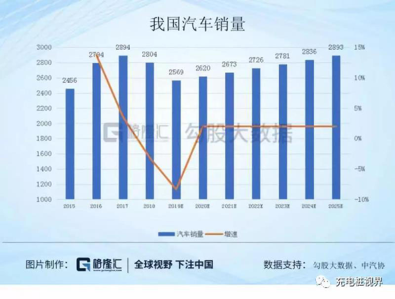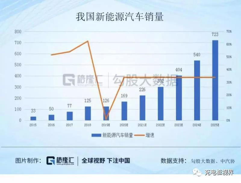 今年我國汽車銷量預(yù)計達(dá)到2569萬輛,假設(shè)汽車行業(yè)2020-2025年復(fù)合增速為2%,銷量達(dá)到2893萬輛,新能源汽車銷量預(yù)計是126萬輛。2025年新能源汽車滲透率為25%,對應(yīng)國內(nèi)新能源汽車銷量為723萬輛,則2019-2025年復(fù)合增速達(dá)34%。34%相比2018年之前的增速要低很多,今年由于補貼退坡因素增長乏力,未來補貼退坡減弱,這個增速是比較合理的。