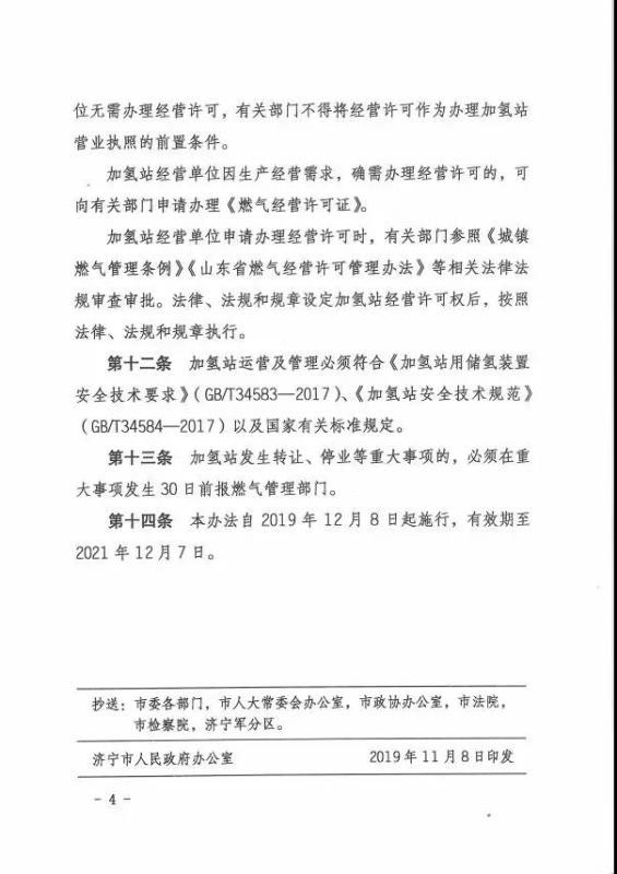 此外,加氫站發(fā)生轉(zhuǎn)讓、停業(yè)等重大事項(xiàng)的,必須在重大事項(xiàng)發(fā)生30日前報(bào)燃?xì)夤芾聿块T。本辦法自2019年12月8日起施行,有效期至2021年12月7日。