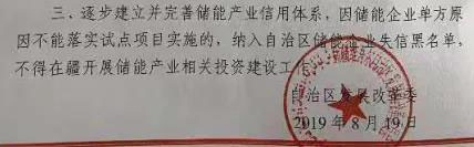 新疆方面為規(guī)范市場,基于貫徹政策的嚴(yán)肅性,在8月份還出臺(tái)了一份補(bǔ)充通知,對單方面不能落實(shí)試點(diǎn)項(xiàng)目實(shí)施的儲(chǔ)能企業(yè),將拉入失信黑名單,以后不得在新疆開展儲(chǔ)能產(chǎn)業(yè)相關(guān)投資建設(shè)工作。