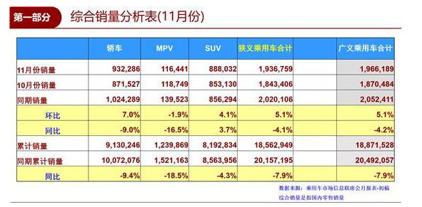 昨日(12月9日),乘用車市場信息聯(lián)席會(以下簡稱“乘聯(lián)會”)發(fā)布數(shù)據(jù)顯示:11月,我國狹義乘用車銷量達(dá)到1936759輛,環(huán)比上漲5.1%,同比下滑4.1%,下滑幅度繼續(xù)小幅收窄;推動(dòng)1-11月累計(jì)銷量同比下滑進(jìn)一步收縮至7.9%,達(dá)到18562949輛。
