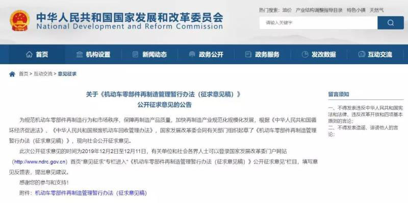 近日,發(fā)改委發(fā)布《機(jī)動(dòng)車零部件再制造管理暫行辦法(征求意見(jiàn)稿)》(以下簡(jiǎn)稱《暫行辦法意見(jiàn)稿》),面向社會(huì)公開(kāi)征求意見(jiàn)。