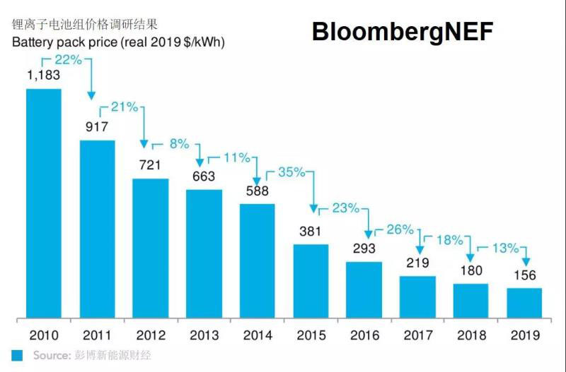 彭博新能源財(cái)經(jīng)2019年全球鋰離子電池價(jià)格調(diào)研發(fā)現(xiàn),鋰離子電池組的平均價(jià)格為156美元/千瓦時(shí),與我們一年前預(yù)測(cè)的價(jià)格相近。今年我們對(duì)新能源乘用車(chē)、電動(dòng)大巴和商用電動(dòng)車(chē)、儲(chǔ)能等細(xì)分市場(chǎng)分別進(jìn)行了調(diào)研,共收集了超過(guò)100個(gè)樣本點(diǎn)。今年的價(jià)格相比去年下降了13%。