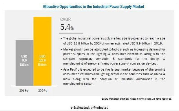 中國(guó)儲(chǔ)能網(wǎng)訊:國(guó)際市場(chǎng)研究機(jī)構(gòu)Markets and Markets發(fā)布報(bào)告稱,到2024年,全球工業(yè)電源市場(chǎng)規(guī)模預(yù)計(jì)將從2019年的99億美元的價(jià)值增長(zhǎng)到128億美元,在預(yù)測(cè)期內(nèi)的復(fù)合年增長(zhǎng)率為5.4%。市場(chǎng)的增長(zhǎng)歸因于美國(guó),中國(guó)和印度等國(guó)家對(duì)工業(yè)電源的高需求。