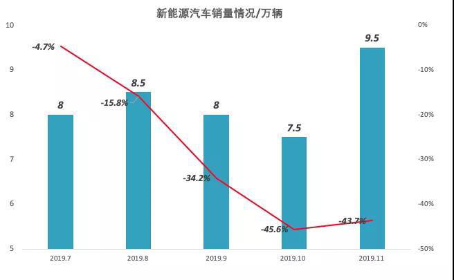 2019年12月9日,中國汽車工業(yè)協(xié)會對外發(fā)布了11月份的車市銷量,沒有懸念,新能源汽車銷量僅為9.5萬輛,同比下跌43.7%。