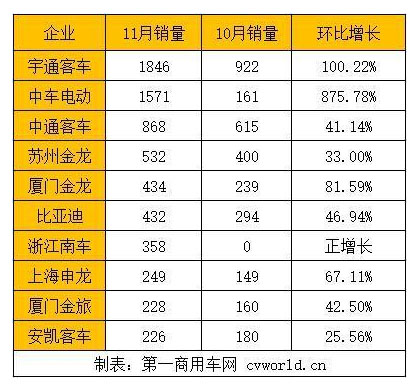 環(huán)比來(lái)看,前十企業(yè)則均實(shí)現(xiàn)大幅增長(zhǎng)。如安凱增25.56%,“三龍”——廈門(mén)金龍、蘇州金龍、廈門(mén)金旅分別增長(zhǎng)81.59%、33%和42.5%,比亞迪增長(zhǎng)46.94%,中通客車增長(zhǎng)41.4%……比較引人注意的是宇通、中車電動(dòng)和浙江南車。其中,宇通在10月高銷量的基礎(chǔ)上環(huán)比增幅超過(guò)100%,11月銷量接近2000輛;中車電動(dòng)11月大爆發(fā),銷量環(huán)比暴漲875.78%,繼宇通之后也跨入千輛級(jí)別;浙江南車11月銷量為358輛,超過(guò)其前十月新能源客車銷量之和,空降行業(yè)第七位。