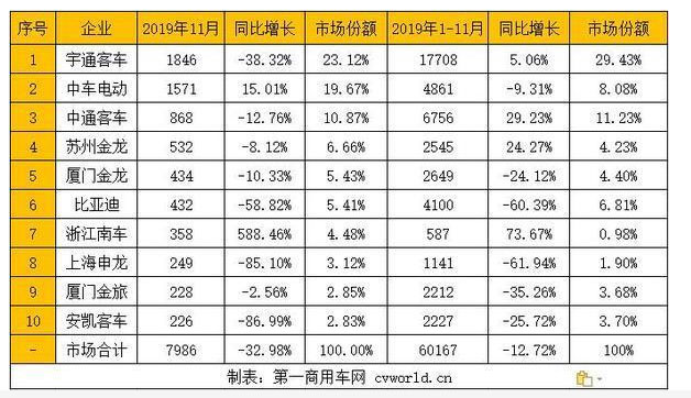 注:本表中剔除了2019年和2018年10月及1-11月中通客車6-7米物流車銷量
