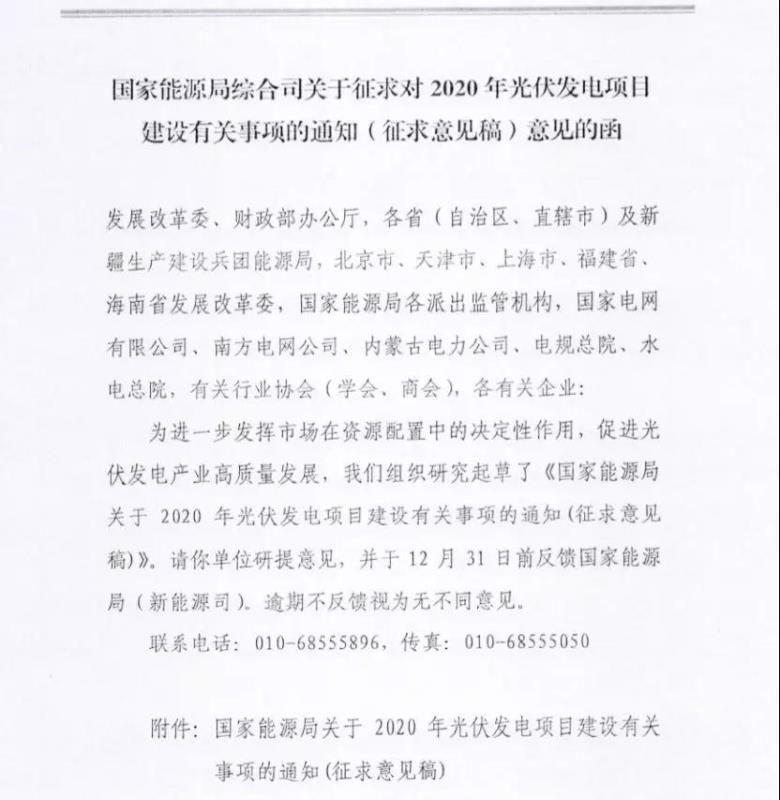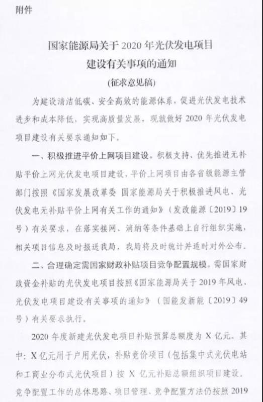 近日,光伏們獲悉,各省能源主管部門已經收到國家能源局下發(fā)的《關于征求對2020年光伏發(fā)電項目建設有關事項的通知(征求意見稿)意見的函》。