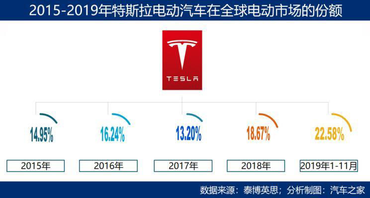 特斯拉不僅是全球電動汽車的提神之作,在市場增長中的作用也越來越凸顯。在特斯拉勢如破竹的2018年和2019年,剔除特斯拉銷量以后的全球電動車市場增速,都會有所降低:2018年,全球純電動市場增長69%,剔除特斯拉的量以后,增幅降為59%;2019年前十一個月,全球純電動市場增長26%,剔除特斯拉的量以后,增幅降為19.5%。——如果沒有特斯拉,全球電動車市場的成長真的會慢不少。