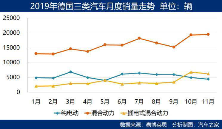 3、德國的電動汽車銷量呈走低之勢,盡管政府承諾將提高對電動汽車的補貼,但混動市場在量與走勢上都更領先;