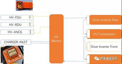 整個回路就變成如下圖所示,HVIL高壓互鎖物理是針對高壓回路的母線束連接器,這里就切分成三個,整車外部連接的HVIL回路1(外部的一組連接回路)、內(nèi)部高壓連接器HVIL2(包含內(nèi)部的三個連接器)和快充高壓線束和連接器的完整性。