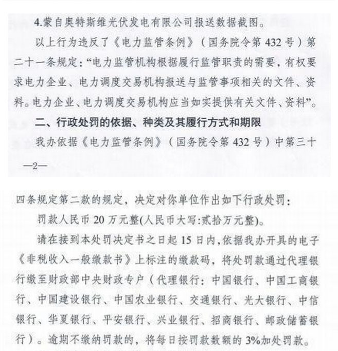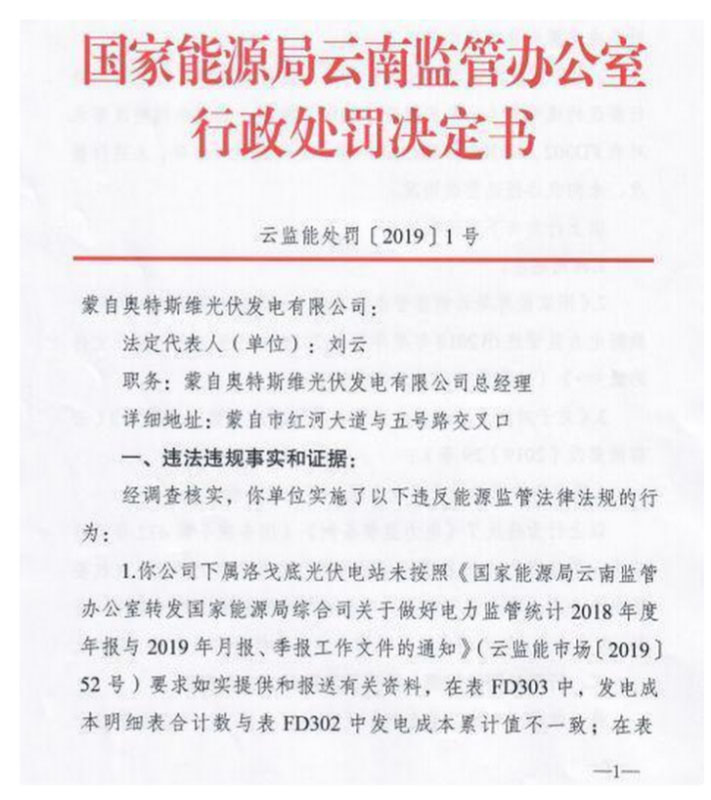 日前,國(guó)家能源局云南監(jiān)管辦公室發(fā)布了一則行政處罰決定書(shū),文件顯示,經(jīng)云南能監(jiān)辦調(diào)查核實(shí),蒙自?shī)W特斯維光伏發(fā)電有限公司下屬洛戈底光伏電站未按照云南能監(jiān)辦有關(guān)文件要求如實(shí)提供和報(bào)送有關(guān)資料,后期未按整改要求對(duì)存在的問(wèn)題進(jìn)行解釋,未進(jìn)行整改,未向云南能監(jiān)辦報(bào)送整改情況,由此被處罰款人民幣20萬(wàn)元整。