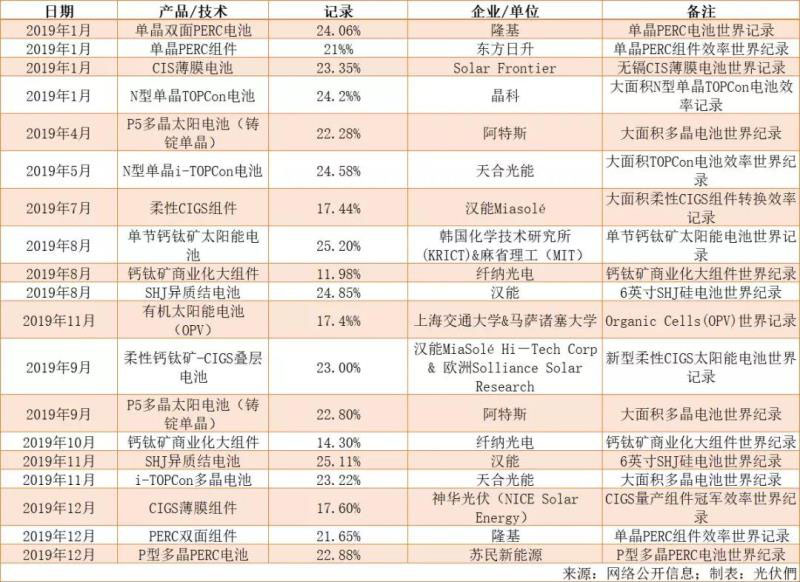 除了產(chǎn)業(yè)化的技術外,各企業(yè)研發(fā)單位、科研機構等研發(fā)的腳步也從未停止。根據(jù)光伏們不完全統(tǒng)計,2019年電池組件至少創(chuàng)造20項以上的世界效率記錄,既包括已成為市場主流的PERC產(chǎn)品,也包括異質結、TOPCon、鈣鈦礦等尚未大規(guī)模產(chǎn)業(yè)化的前沿技術。