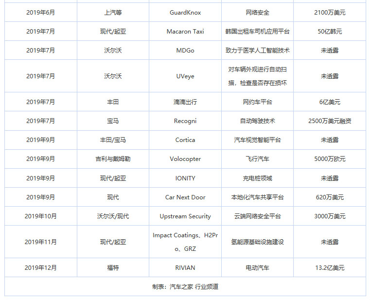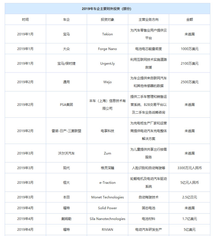 汽車銷量下行、電動(dòng)化加劇之際,汽車企業(yè)對(duì)外投資也發(fā)生了變化。今年以來(lái),我們很少聽(tīng)到車企大規(guī)模、數(shù)十億美元的對(duì)外投入,更多是的“大眾計(jì)劃投資超4600億加速電動(dòng)化轉(zhuǎn)型”“現(xiàn)代汽車預(yù)留3620億布局新技術(shù)”等自我修煉“內(nèi)功”的聲音傳出。不過(guò),從“零星”的車企對(duì)外投資項(xiàng)目,我們也能看出企業(yè)未來(lái)布局方向。