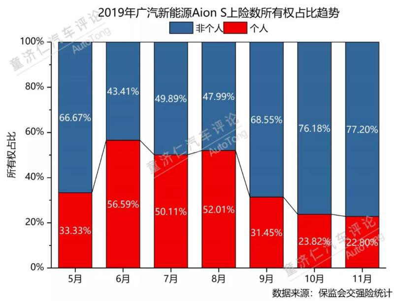 根據(jù)上險(xiǎn)數(shù)的統(tǒng)計(jì),自6月后,Aion S非個(gè)人所有權(quán)比例逐月上升,至10月后已經(jīng)占比近八成。如果按照銷售總量簡單估算,Aion S每月實(shí)際銷售給個(gè)人的數(shù)量基本也在1,000-2,000輛之間,與幾何A、秦Pro EV基本相當(dāng)。