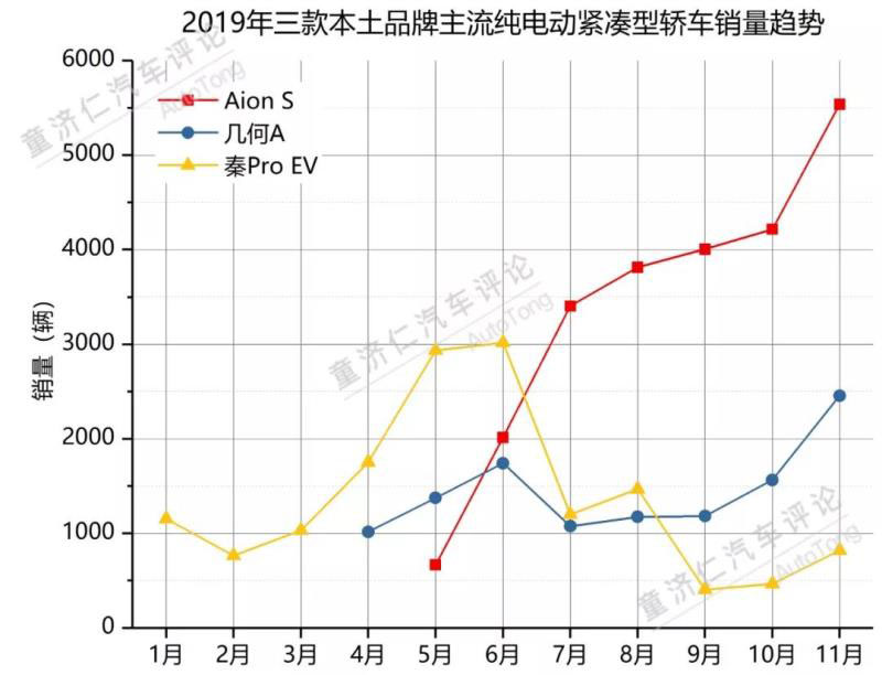 不難看出,官方統(tǒng)計(jì)口徑中,整體市場中個(gè)人購買新能源汽車的比例大約在50%-60%的水平。那么,如果再具體到家用消費(fèi)最主流的細(xì)分市場——緊湊型轎車市場,情況是否會(huì)有變化?今年前11個(gè)月,三款本土品牌主流純電動(dòng)緊湊型轎車——廣汽新能源Aion S、吉利幾何A、比亞迪秦Pro EV的銷量走勢也許能說明問題。
