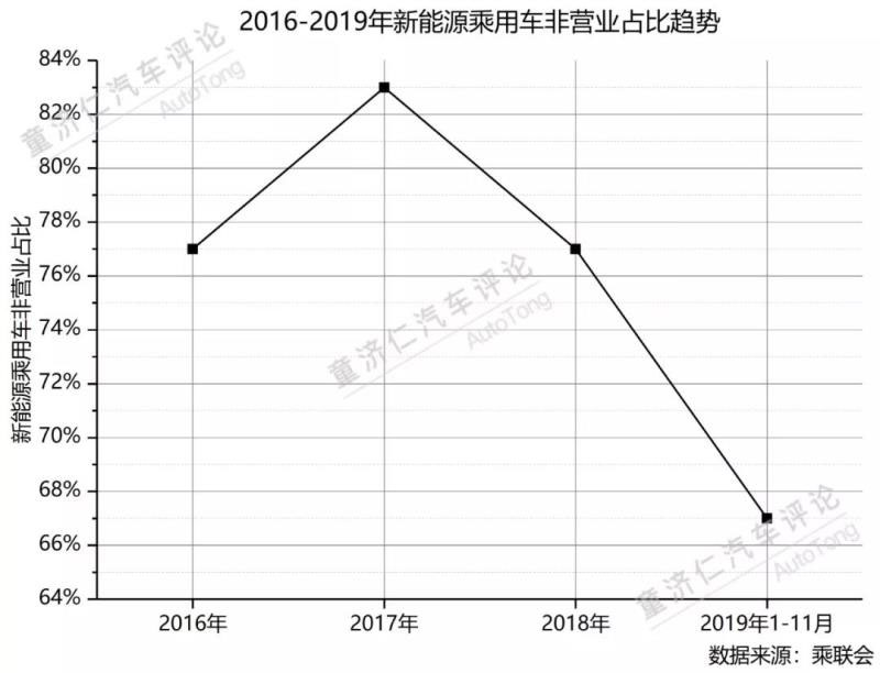 而在乘聯(lián)會(huì)的數(shù)據(jù)中,今年1-11月純電動(dòng)乘用車非營業(yè)的比例為67%,是近四年來的最低值,意味著出租租賃等單位新能源乘用車采購占比在逐步提升。