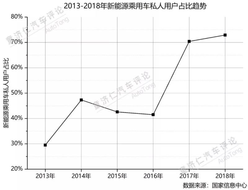 在公共領(lǐng)域的示范和新能源汽車技術(shù)、配套基礎(chǔ)設(shè)施進(jìn)步的刺激下,私人購買新能源汽車的比例逐漸提升。根據(jù)國家信息中心的數(shù)據(jù),2018年,私人用戶在新能源乘用車領(lǐng)域占比達(dá)到72.9%。