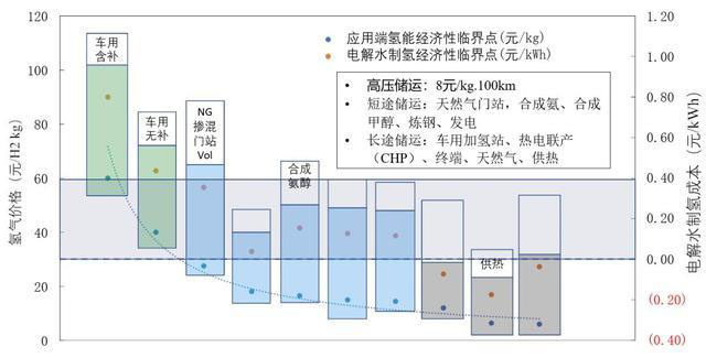 電解水制氫成本與應用場景經濟性臨界點示意圖