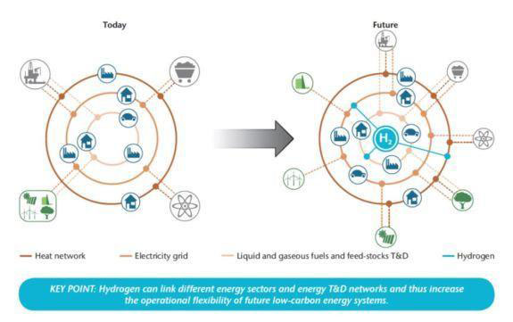 我們認為未來20年,電能還是站在一個主流的位置,但氫能是一個不可替代的配角,用于實現不同能源網絡之間的互聯。通過氫能,我們可以把目前的熱網、電網和油氣管網之間形成一個協調。也就是說,未來我們能源體系的優(yōu)化,不僅僅局限在某一個能源品種里面,而是可以通過氫能實現整體的優(yōu)化,甚至通過氫能實現能源其他行業(yè)之間的互動。