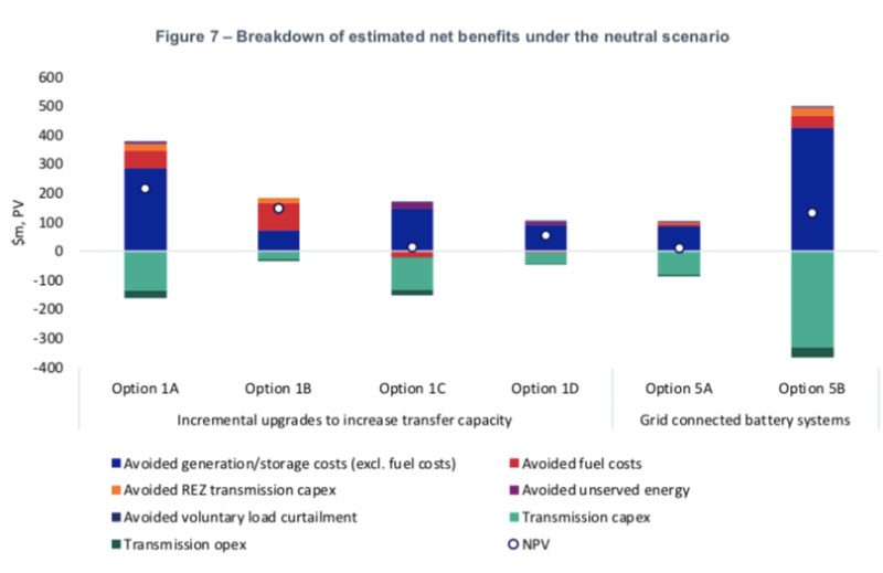 Transgrid公司在調(diào)查報告中指出,“雖然5B方案提供了最大的總收益,但在這種情況下,預(yù)計只能提供方案1A預(yù)期凈收益的60%。這是因為該選擇方案具有較高的前期投資成本,并且電池儲能系統(tǒng)的資產(chǎn)壽命較短,因此需要在評估期內(nèi)進(jìn)行再投資?!?