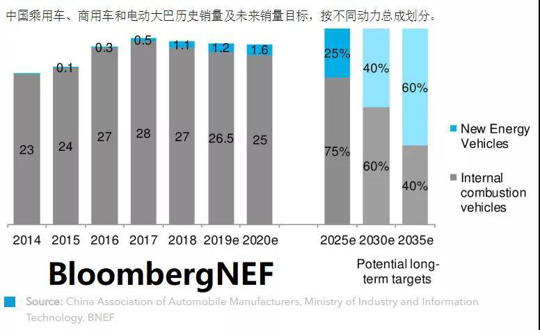 新規(guī)劃將新能源新車新車銷量占比目標上調(diào)至25%。假設(shè)新車總銷量保持在2018年的水平,達到2800萬,則2025年新能源汽車銷量需達到700萬。在上一次提出的汽車產(chǎn)業(yè)規(guī)劃中,新能源汽車銷量占比目標為20%。BNEF 2019年的新能源汽車展望報告預(yù)測,2025年中國新能源汽車新車銷量占比略低于20%。