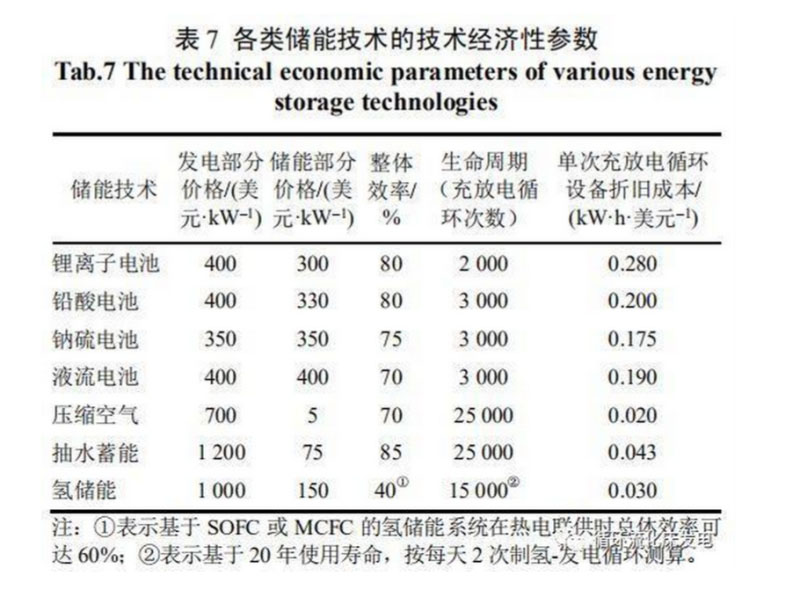 氫儲能相較于其他儲能方式的劣勢在于能源轉(zhuǎn)化效率低、成本高。美國Sandia國家實驗室在2015年發(fā)布了關于儲能技術(shù)經(jīng)濟性分析的報告,總結(jié)了各種已商業(yè)化的儲能技術(shù)的價格、效率及使用壽命,見表7。目前常用電化學電池的效率為70%~80%,而氫儲能系統(tǒng)即便在考慮熱電聯(lián)供的條件下效率也僅有40%左右。
