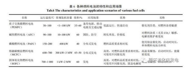 燃料電池能將氫的化學能直接轉(zhuǎn)化為電能,具有較高的能量轉(zhuǎn)換效率,因此燃料電池發(fā)電是未來氫能利用的主流技術(shù)。根據(jù)工作溫度和電解質(zhì)的不同,燃料電池分為中低溫條件下工作的質(zhì)子交換膜燃料電池(protonexchangemembranefuelcell,PEMFC)、堿性燃料電池(alkalinefuelcell,AFC)和磷酸燃料電池(phosphoricacidfuelcell,PAFC),此外還有在高溫工況下工作的熔融碳酸鹽燃料電池(moltencarbonatefuelcell,MCFC)和固體氧化物燃料電池(solidoxidefuelcell,SOFC)。據(jù)美國能源部發(fā)布的氫燃料電池技術(shù)比較,各種燃料電池的特性和應用場景見表6。