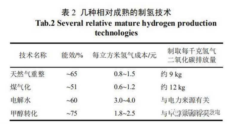 目前,主要以煤或天然氣等為原料來制取氫氣,來源于化石燃料的氫氣約占氫氣總產(chǎn)量的95%。幾種相對成熟的制氫技術(shù)見表2。我國是世界上氫氣產(chǎn)量最大的國家之一,年產(chǎn)氫氣量約2000萬t,占世界氫總產(chǎn)量的1/3,并以煤氣化制氫為主。在煤炭價格為500元/t的情況下,煤制氫的成本約0.7元/m3。但是,此類技術(shù)需要結(jié)合CO2捕集和封存技術(shù)才能解決碳排放問題,因此不能作為氫能的長久來源。