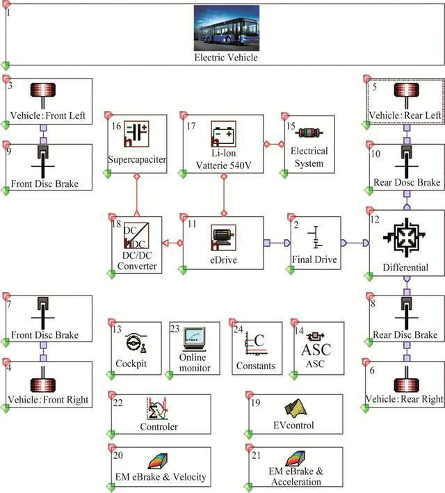 應(yīng)用汽車仿真軟件Cruise構(gòu)建了電動(dòng)客車整車模型,并將中國(guó)城市道路工況下的仿真結(jié)果與鋰電池單獨(dú)供電進(jìn)行對(duì)比分析。搭建實(shí)驗(yàn)臺(tái)架,通過(guò)實(shí)驗(yàn)來(lái)驗(yàn)證所提模糊控制策略在降低鋰電池充放電電流、降低系統(tǒng)能耗等方面的有效性。
