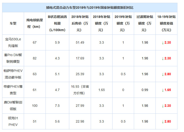 插電式混合動力車型2018年與2019年國家補(bǔ)貼額度新舊對比