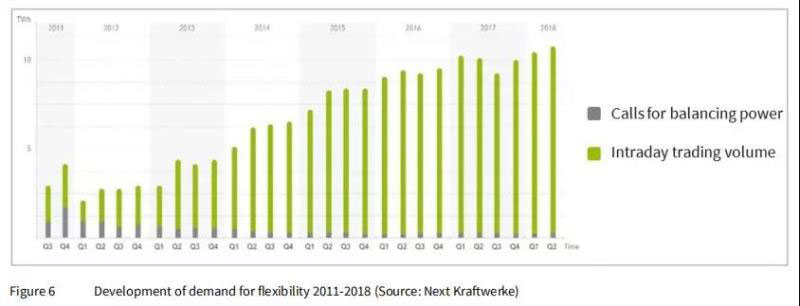 圖6 2011-2018年靈活性需求的增長(灰色:電力平衡的需求;綠色:當(dāng)天交易量)