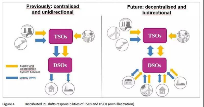 圖4 分布式可再生能源使輸電系統(tǒng)運(yùn)營商(TSOs)和配電系統(tǒng)運(yùn)營商(DSOs)轉(zhuǎn)換角色