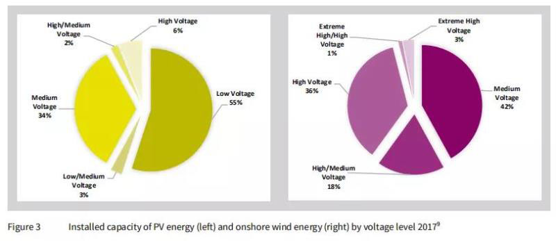 圖3 2017年光伏能源的裝機(jī)容量(左)與陸上風(fēng)能(右)的電壓等級(jí)占比(低電壓:400伏,中電壓:10/20/30千伏,高電壓:110千伏)