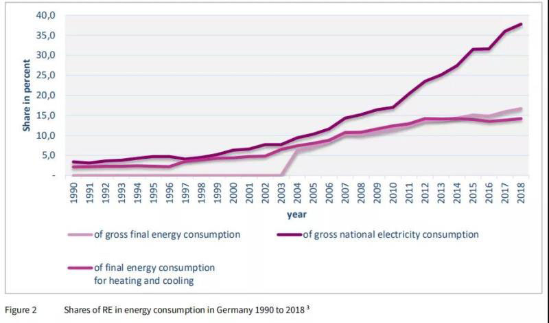德國的氣候目標(biāo)是在2030年前電力系統(tǒng)的可再生能源比例達(dá)到65%。在可再生能源轉(zhuǎn)型下,德國能源消費(fèi)的可再生能源比例從1990年的4.6%上升至2018年的約38%。