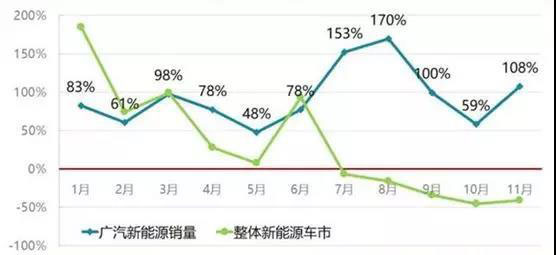 在躑躅于下行通道的新能源車市中,廣汽新能源是唯一一家在2019年實現(xiàn)月銷量連續(xù)上漲的新能源車企(下圖)。