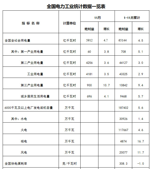 12月17日,國家能源局發(fā)布1-11月份全國電力工業(yè)統(tǒng)計(jì)數(shù)據(jù)。
