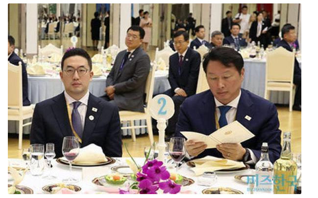 2018年朝韓首腦會(huì)議,左邊為L(zhǎng)G會(huì)長(zhǎng)具光謨,右邊為SK會(huì)長(zhǎng)崔泰源