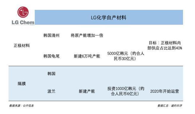 LG一直都在自產(chǎn)正極材料,但現(xiàn)在他們打算將自產(chǎn)的比例提高,在2019年一季度電話會(huì)議上,LG化學(xué)宣布了正極材料內(nèi)部供應(yīng)率40%的目標(biāo)。目前,LG正在韓國(guó)清州和龜尾擴(kuò)建其正極材料產(chǎn)能。