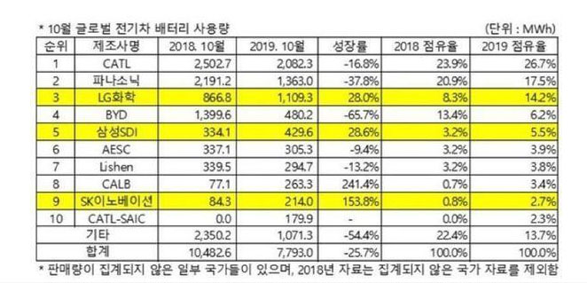 韓國(guó)人不無(wú)嘲諷的表示,根據(jù)SNE研究的報(bào)告,2019年10月,全球EV電池裝機(jī)量與去年同期相比,下降了25.7%,但是韓國(guó)的三家公司均實(shí)現(xiàn)了大幅度的正增長(zhǎng)。(其中排在第8名的中航鋰電也實(shí)現(xiàn)了大幅增長(zhǎng),但是韓國(guó)人視為雜音,選擇無(wú)視。)
