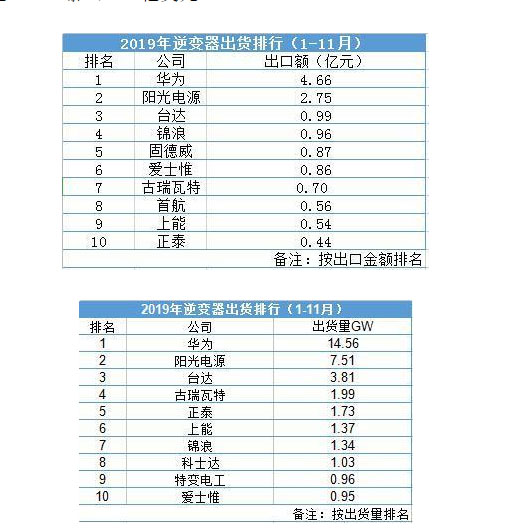 2019年1-11月,華為海外逆變器出貨量超過(guò)14.56GW,出口額4.66億美元,穩(wěn)居2019年逆變器海外出貨量龍頭。陽(yáng)光電源出貨量7.51GW,出口額2.75億美元,排名第二,臺(tái)達(dá)出貨量3.81GW,出口額0.99億美元,位居第三。出貨量排名四至十名依次為古瑞瓦特(1.99GW)、正泰(1.73GW)、上能(1.37GW)、錦浪(1.34GW)、科士達(dá)(1.03GW)、特變電工(0.96GW)、愛(ài)士惟(0.95GW)。出口額出貨量排名四至十名依次為錦浪(0.96億美元)、固德威(0.87億美元)、愛(ài)士惟(0.86億美元)、古瑞瓦特(0.70億美元)、首航(0.56億美元)、上能(0.54億美元)、正泰(0.44億美元)。