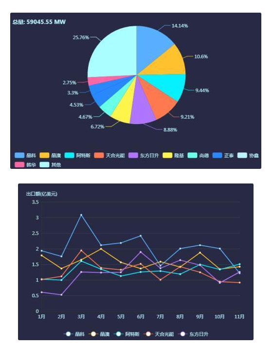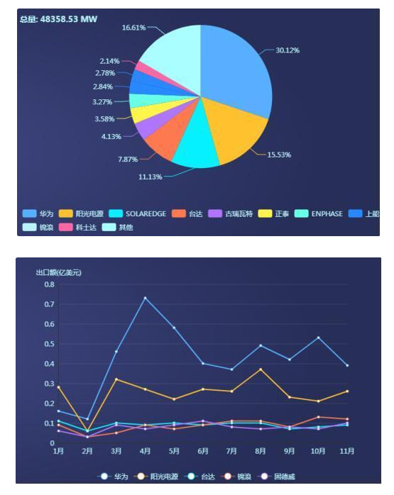 今年1-11月,中國(guó)光伏組件總出貨量59.05GW,總出口額151.17 億美元,全年出口有望突破65GW;逆變器總出貨量48.36GW,總出口額21.24 億美元,全年出口有望突破55GW。